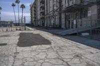 A view of the city streets and architecture in Los Angeles, California, USA, featuring concrete roads, asphalt pavement, and a tree-lined neighborhood.