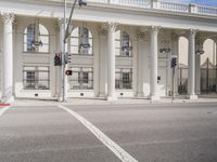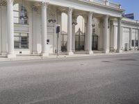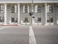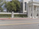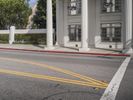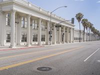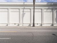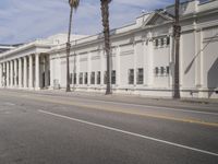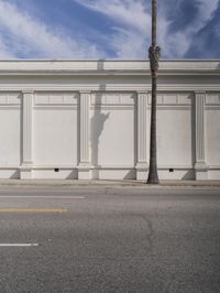 A view of the classic architecture of Los Angeles, California, USA, with its store fronts, white walls, and tile floors, surrounded by a clear sky and a road surface lined with vegetation, including a palm tree, and a wooden column, creating an ideal vacation destination, filled with homes and other properties, and ancient Roman palaces.