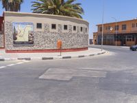 A clear sky over the residential area in Luderitz, South Africa, with a view of the city buildings, asphalt road, and street lights.