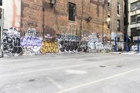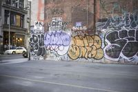 A profile of an urban landscape in Manhattan, New York. The view includes a tree, a graffiti wall, a low asphalt road, an open space, and a parking lot. The scene is a mix of industrial infrastructure, urban design, and vegetation.