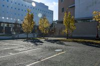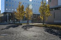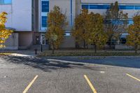 A view of a modern office building in the business district of Ottawa, Canada. The city is bathed in sunlight with clear blue skies, casting hard shadows on the road surface. The urban design features trees and vegetation, providing a touch of nature amidst the bustling city life.