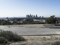 A scenic view of the city skyline from a high shore, with the sun visible in the clear sky. The landscape includes asphalt roads, sand and gravel surfaces, grassy lots, trees, and a nearby wetland or reservoir.