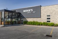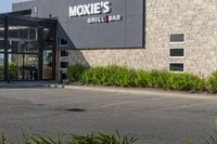 Aerial view of an urban landscape in Toronto, Ontario, Canada. The photo showcases the architecture of office buildings, storefronts, and residential areas. The straight road leads to a parking lot, surrounded by grass and vegetation. The clear sky highlights the concrete and asphalt surfaces of the city.