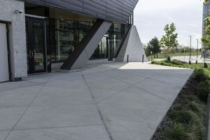the curb in front of a modern building on a street corner with grass in the center