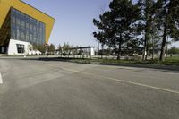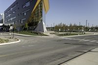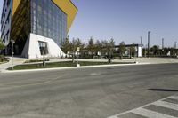 A view of the urban landscape in Toronto, Canada, featuring a mixture of modern architecture, office buildings, and residential areas. The city is bustling with business activity in its financial district, with roads and thoroughfares lined with trees and vegetation. The clear sky and yellow street lights create a vibrant atmosphere in this metropolitan area.