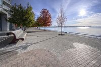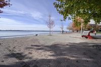 A sunny day in Toronto, Ontario, showcasing the city's architecture and urban landscape with a road and coastal views. The beautiful waterfront, lined with trees and surrounded by nature, creates a serene atmosphere. The sunlight filters through the autumn deciduous leaves, casting a warm glow on the woody plants. The horizon blends seamlessly with the clear blue sky, reflecting on the calm waters of the lake. This picture captures the essence of a perfect day in the vibrant city of Toronto.