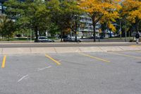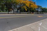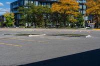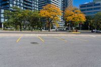 A view of the bustling city of Toronto, Ontario, with its vibrant urban design and straight road leading towards a parking lot. The asphalt surface reflects the clouds in the sky, creating a striking image with hard shadows on a sunny day.