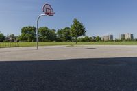 A view of the city of Toronto, Ontario, showcasing its urban infrastructure and open spaces. The road surface and signage lead to a parking lot near a stadium, surrounded by green grass and trees. The clear sky adds to the beauty of this suburban public space, perfect for team sports like basketball.