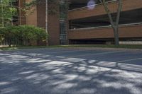 A view of the urban landscape in Toronto, Ontario, Canada. The photo captures a city scene with buildings, open spaces, and a parking lot. The asphalt road surface is lined with curbs and surrounded by grass, trees, and vegetation. The clear sky overhead casts hard shadows, adding depth and dimension to the image.