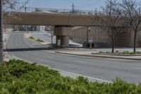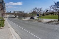 A view of the modern architecture and city life in Toronto, Ontario, Canada with lush vegetation, infrastructure, and road surface.
