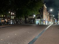 A view of the city at night in Amsterdam, Netherlands. The asphalt road surface, white and black curb, street lights, and store fronts make up the urban landscape and infrastructure of this residential area. A bicycle wheel and a tree with a houseplant provide a hint of nature in this urban design.