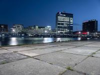 An illuminated cityscape of Amsterdam, Netherlands, is seen at night, with its high-rise buildings, tar roads, and reflections on the river and harbor. Urban design, vegetation, and water resources create a unique atmosphere and illustrate the city life of this European coastal metropolis.
