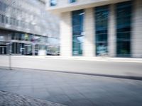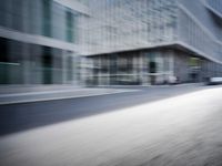 A view of a modern mixed-use residential area in Berlin, Germany, showing a fast-paced business district on a winter day. Automobiles, bicycles, and pedestrians populate the public space, as the skyline is dominated by corporate headquarters and office buildings.