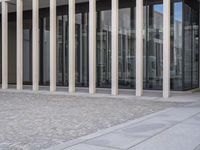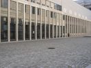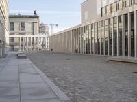 The James Simon Gallery welcomes tourists to the vibrant city of Berlin, Germany. Brutalist architecture can be seen in the foreground with beige sandstone and concrete, while metal balusters line the walkway. The cobble stone curb and glass windows of the mixed-use building add to the classic cityscape of the neighborhood.