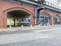 A modern building with an arcade facade and cobble stone road surface in the metropolitan area of Berlin, Germany stands out against the clear sky. Urban design, city life, and public transportation are all evident in the neighborhood.