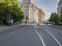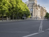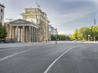 The Brandenburg Gate and Reichstag Building, popular tourist attractions, are seen in the clear sky of a summer day in Berlin, Germany. The tree-lined road and classic architecture of the residential area create an iconic urban design, while people and cars move through the urban thoroughfare in the metropolitan area. Public space, infrastructure, and buildings provide the basic elements of city life.