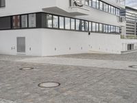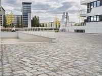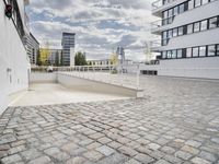 A snapshot of modern architecture in the metropolitan area of Berlin, Germany. The cityscape is filled with residential areas, office buildings, highways and open spaces. The cobblestone road, yellow facade and white profile of the buildings create a beautiful contrast with the clear sky and concrete street.