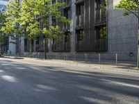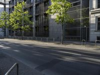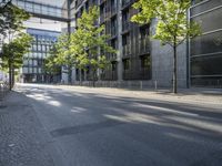 A cityscape view of the modern architecture in Berlin, Germany, featuring a lane of asphalt with a sunlit yellow leaf on the curb. The residential area is surrounded by office buildings and public spaces, creating a unique urban design in Europe.