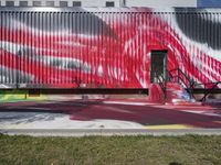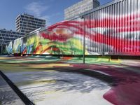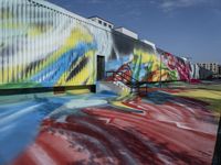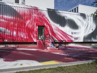 A view of an urban design in Berlin, Germany, featuring a modern art gallery, graffiti wall, and a shipping container in the courtyard of an office building. The vibrant colors of the cityscape, including magenta, blue, yellow, and green, are set against the clear European sky.