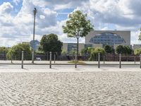 A view of a vibrant urban neighborhood in Berlin, Germany, featuring modern architecture, a cobblestone street, and a residential area with vegetation, trees, and a public space. A clear blue sky frames the scene, highlighting the roads, street lights, and infrastructure of the area.