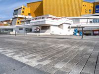 A modern road surface of asphalt and pavers, leading to a residential area in Berlin, Germany. The light of dawn casts a glow on the city's urban design and architecture, with facades of houses, windows, and entryways visible in the neighborhood. Curbs, driveways, and public spaces also make up part of the modern cityscape.