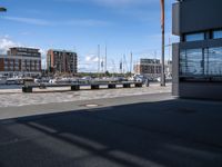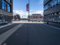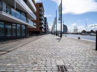 A view of the bustling city of Bremen, Germany, on a sunny day. The urban design of the city shows off its modern architecture, cobble stone roads, and classic facades. Gas lamps and street lights line the roads, and the harbor can be seen in the distance.