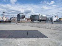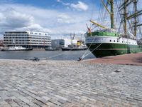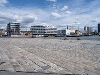 View of a modern cityscape in Bremen, Germany with a composite material road and asphalt roofing among tall buildings, harbor, pier, jetty, boat, coastal landscape, and clear sky. Residents enjoy urban design, modern architecture, and residential area with cobble stone flooring, street light, concrete curb, parking facades, and parks.