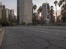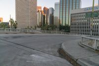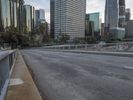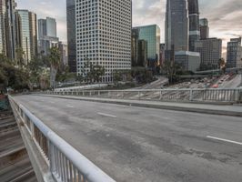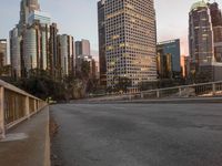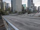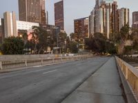 A view down a city street in the early morning, with a mix of high-rise buildings, infrastructure, and trees creating a metropolitan skyline. The asphalt road curves around the guard rails and walkways, while automobiles and transport cross the crosswalk and bridge.