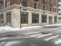 The city of Detroit, USA, in the winter, showing the metropolitan area's classic architecture, infrastructure, and residential areas with motor vehicles and pedestrians crossing a snow-covered road surface.