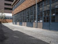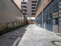 A view of an alley-way in the Hinterhof neighborhood of a European city, showcasing the classic architecture of the buildings, cobble stone flooring, and urban design elements such as the manhole cover, brick wall, and bicycle.
