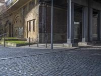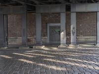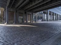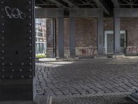 A view of Berlin's art district with sunlight reflecting off the cobblestone floor, brickwork, and steel beams of the city's infrastructure, including a bridge, house, and underpass.