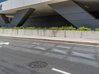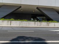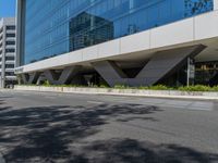 An office building in a busy city street of California casts a hard shadow on the asphalt below, highlighting the modern architecture and urban design of the USA.
