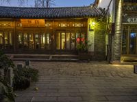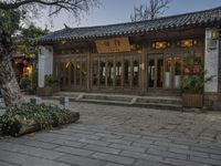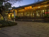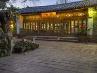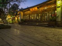 The cobblestone road of Lijiang City, Yunnan, China is lined with residential buildings, trees, and historic architecture. A tourist attraction and place of worship, the city is also home to a variety of restaurant, cafe, and hotel facades lit by the artificial light of night and the yellow hues of the breaking dawn. The city's vibrant urban design is a testament to the unique style of Chinese architecture and its suburban open space.