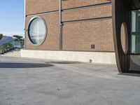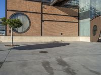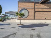Modern architecture in a residential area of Lisbon, Portugal. The scene includes a road surface with a curb, trees, cafe, restaurant, public space, and brickwork. The clear sky creates a hard shadow on the pavement and houses, adding to the city life atmosphere of the coastal neighborhood.