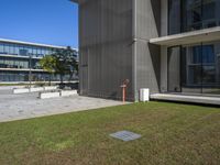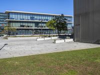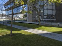 A clear sky day in Lisbon, Portugal reveals the modern architecture of a high-rise office building in the metropolitan area. Symmetrically framed by trees, the urban design includes a paved plaza, grassy open space, and residential condominiums with glass windows, composite material facades, and wood fixtures. The cityscape is illuminated by sunlight and hard shadows, adding a contrast of color and texture to the urban biome.