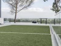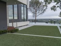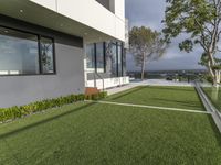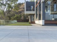 A dawn aerial view of a mixed-use estate in Los Angeles, California, USA. From the balcony of the modern building, the landscape of the urban area can be seen, featuring a swimming pool, a boardwalk, a bench, a garden, and a skatepark. The sun is shining through the trees, casting its light onto the grassy surface and reflecting off the water resources.