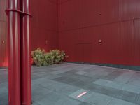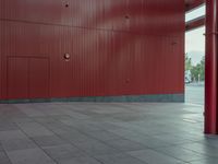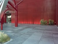 The open space of a courtyard of an urban property in Los Angeles, California features a modern structure with a dome, tile flooring, and walls of wood and red. The early morning light illuminates the parking lot, road surfaces, and walkways as the day begins.