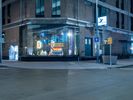 A nighttime view of the modern architecture of a metropolitan area in Holland, with a tire and wheel of a motor vehicle in the foreground and a mixed-use building, hotel and office complex illuminated by artificial light in the background.