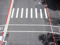 View of the bustling city of Taipei, Taiwan from above, with a motor vehicle driving on the tar and zebra crossing road surface, underpass, bridge, and modern architecture in the background.