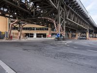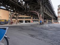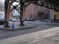 A view of downtown Berlin from a pedestrian crossing, featuring a road surface with a steel bridge, a curb, trees, and a statue in the foreground. The city's infrastructure, including buildings, warehouses, and factories, is visible in the background on this winter day.