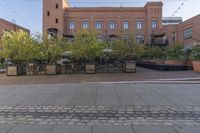 A residential neighborhood in an urban setting, featuring cobblestone roads, brick walls, and open spaces. Concrete, asphalt, vegetation, and public infrastructure add to the city’s character, while the clear blue sky and outdoor furniture create a pleasant atmosphere.