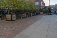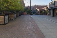 A residential area in the city showcases its infrastructure, with concrete and asphalt surfaces, overhead power lines, street lights, and wood and paver flooring. A clear day brings a light to the trees and the open space, creating a peaceful atmosphere.