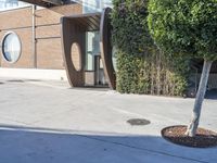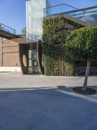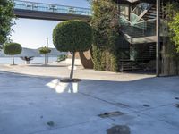 A composite material building in Lisbon, Portugal with a modern architecture and urban design is showcased in the morning sun. The public space is full of tree shadows and vegetation, with blue tints and shades. The open space provides a coastal view with a pier, jetty and harbor. There is a restaurant, cafe and bar nearby, so you can enjoy the city life and eat out. The road offers a hard shadow with concrete surfaces and asphalt, and the wheel of the car adds a unique touch to the urban landscape.