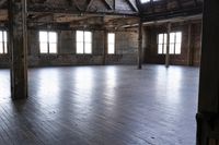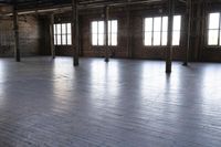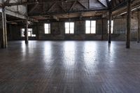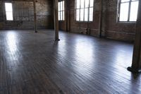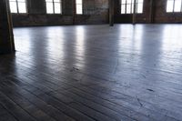A glimpse of an open space loft in a New York City building, featuring a wooden floor, brick walls, and laminate flooring. The wood stain on the hardwood beams and the light coming in through the windows creates a warm and inviting atmosphere in this urban estate.