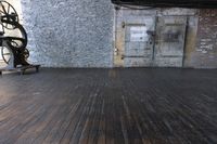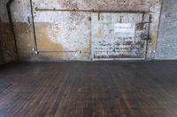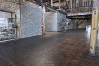 An open loft space in New York City with a view of the city's iconic brickwork, concrete buildings, wood flooring, and hardwood doors.