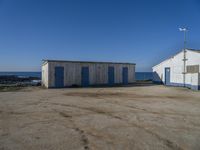 A beautiful natural environment with a lake, mountains, and shoreline near a coastal town in Portugal, with a clear sky above. A combination of asphalt, grass, gravel, and dirt roads, buildings, vegetation, and a horizon of houses, trees, and wood, create a stunning landscape.
