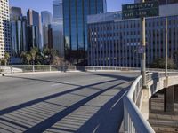 A view of a bustling downtown area, featuring a skyline of high-rises, a bridge, and a skyway, all against a clear sky and hard shadows.