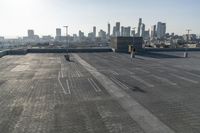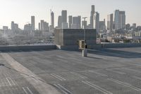 The architecture of a concrete cityscape, with buildings, skyscrapers, parking garages, roads, and a clear sky, at dawn in the metropolitan area of a downtown area.