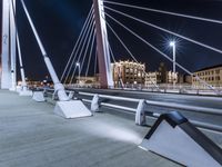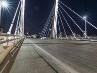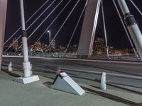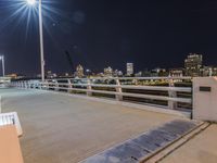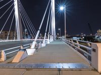 A view of the city skyline of Chicago, Illinois, USA, illuminated by the artificial light of night. The view features a combination of an extradosed bridge, skyway, suspension bridge, cable-stayed bridge, nonbuilding structure, and water, all on an infrastructure of concrete, steel, and metal. A handrail, guard rail, street light, and walkway are visible, straight down the road.