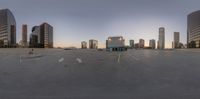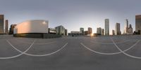 The morning light illuminates the concrete and asphalt surfaces of a downtown metropolitan cityscape, featuring a mix of high-rise buildings, skyscrapers, parking garages and other infrastructure elements.